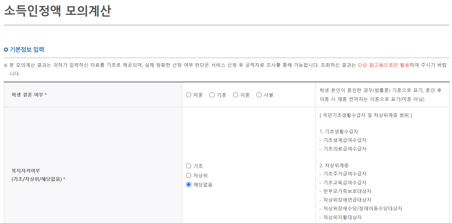 위 버튼으로 아래의 소득인정액 모의계산으로 이동하실수 있습니다.