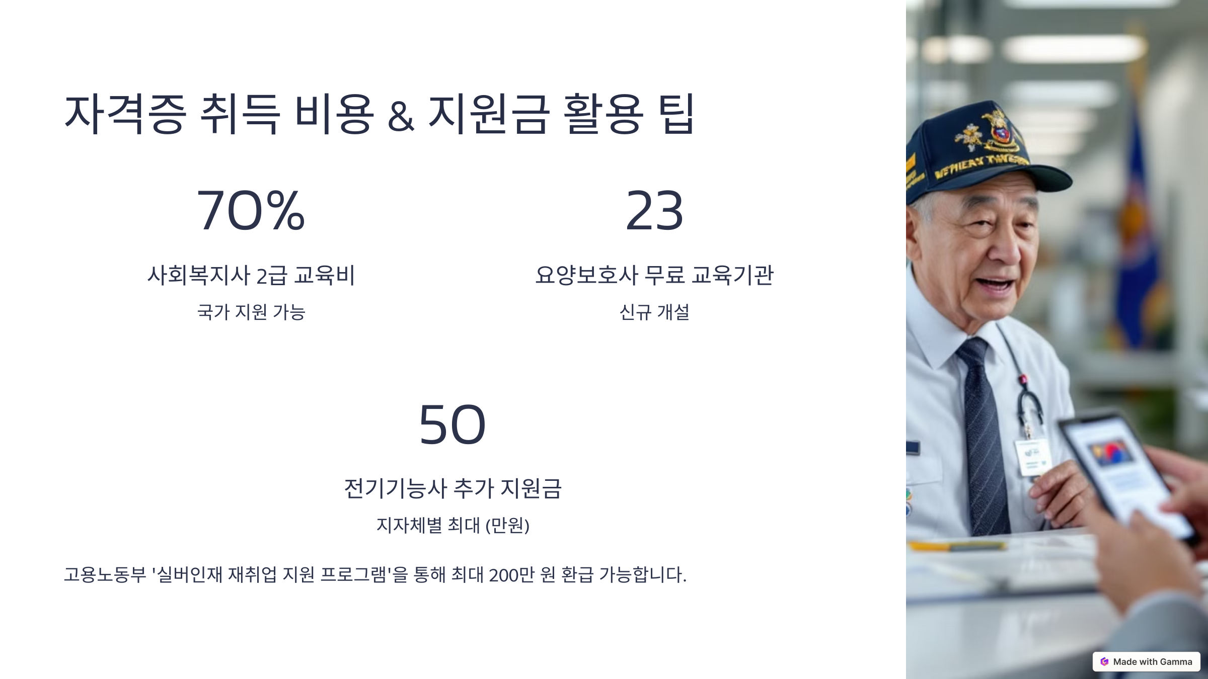 - 사회복지사 2급 : 120~150만 원 (교육비 70% 국가 지원 가능)