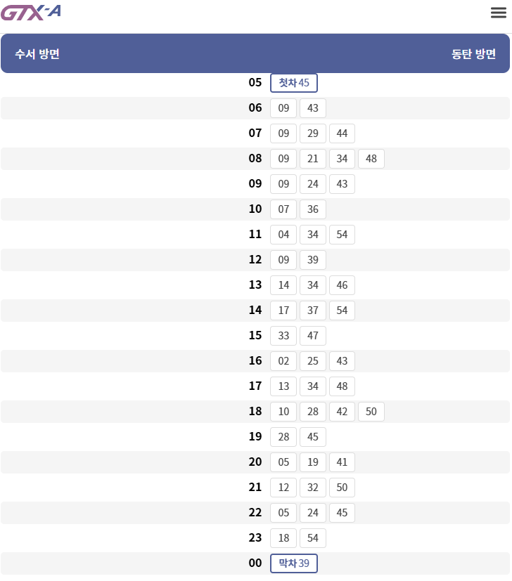 GTX-A 노선 시간표는 이용객들이 출퇴근 시간에 맞춰 편리하게 이용할 수 있도록 간격이 길지 않게 구성되어 있습니다.